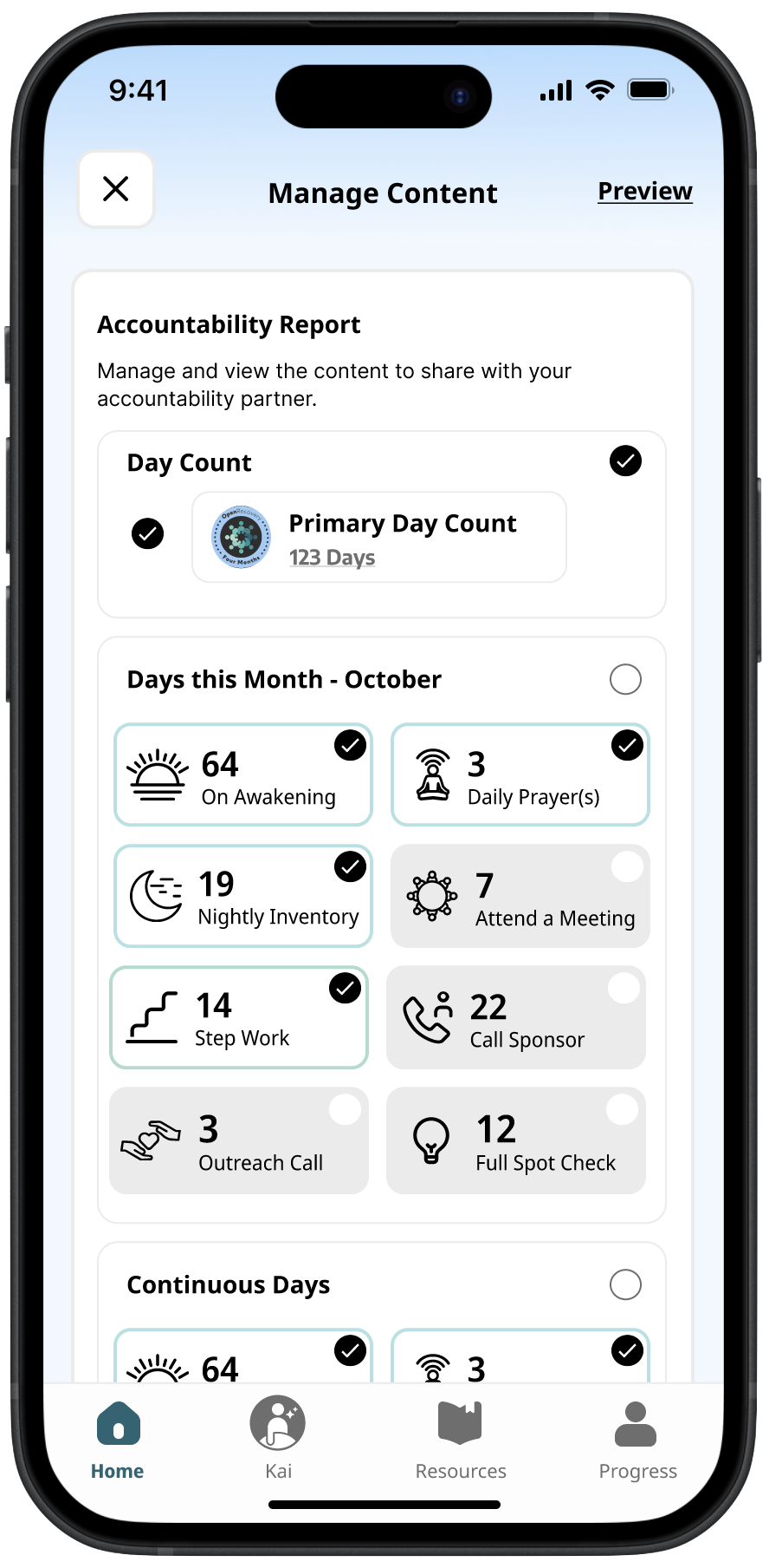 Your Complete Recovery ToolkitTransform your recovery journey with comprehensive support that's there whenever you need it. With Kai, your AI recovery assistant, you can work the steps, process feelings of resentment, fear, and shame, and navigate challenging moments while uncovering meaningful insights about your patterns and growth. With personalized content across more than 20 programs, customizable accountability tools, and a rich library of recovery resources, this thoughtfully designed companion helps you build a stronger foundation—one step at a time.